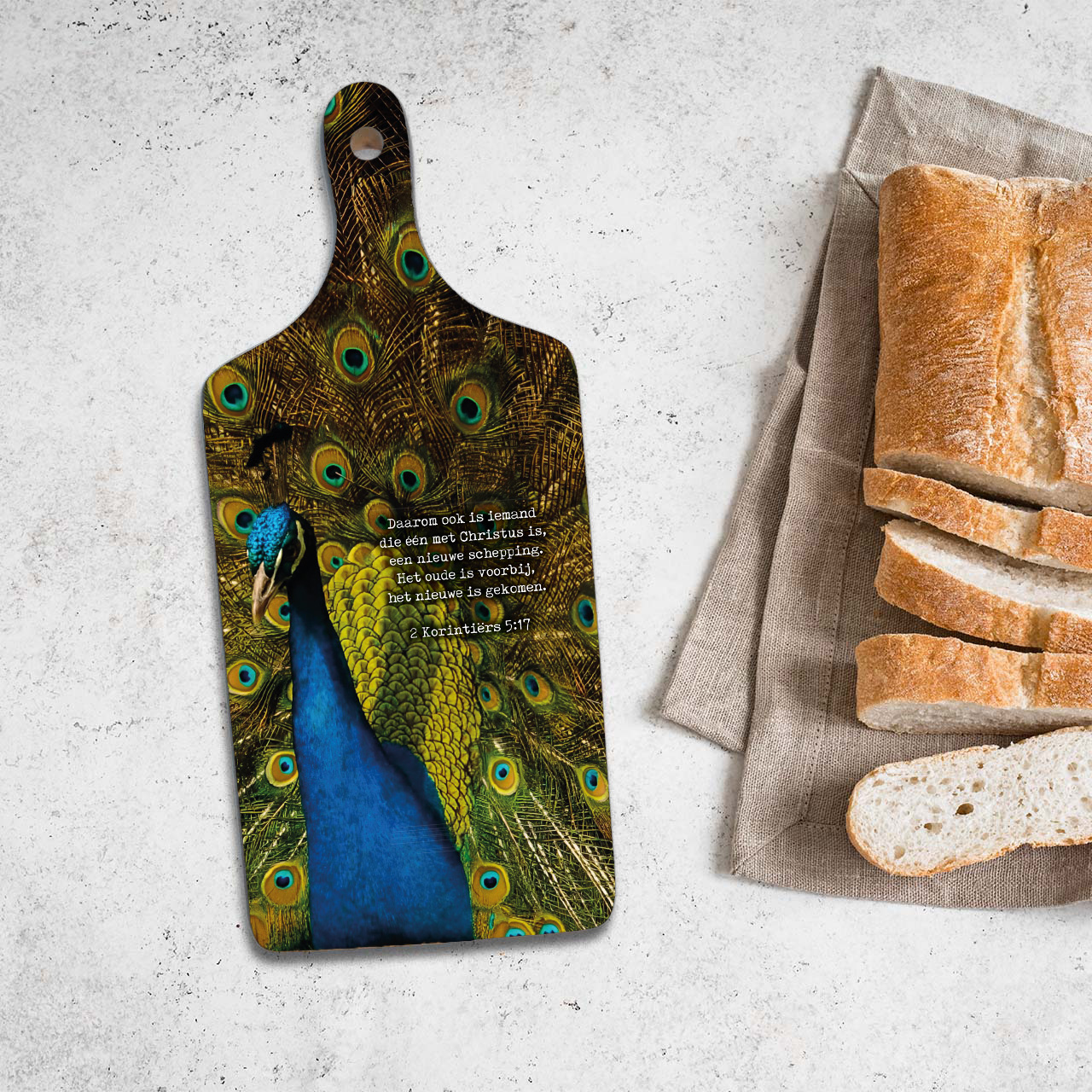Met een schitterende afbeelding van een pauw met uitgestoken veren en de tekst uit 2 Korintiërs 5:17, die gaat over het nieuwe leven in Christus, is deze houten broodplank zowel prachtig als betekenisvol.