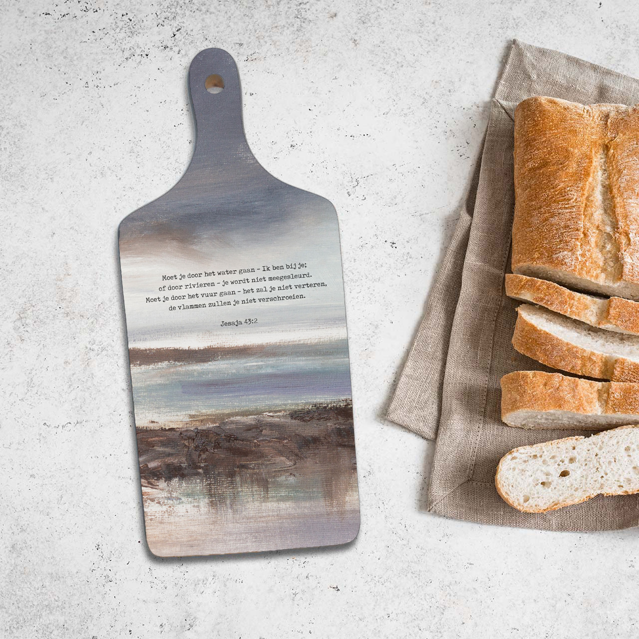 Op deze broodplank staat de bijbeltekst uit Jesaja 43:2: ‘Moet je door het water gaan – Ik ben bij je; of door rivieren – je wordt niet meegesleurd. Moet je door het vuur gaan – het zal je niet verteren, de vlammen zullen je niet verschroeien.’