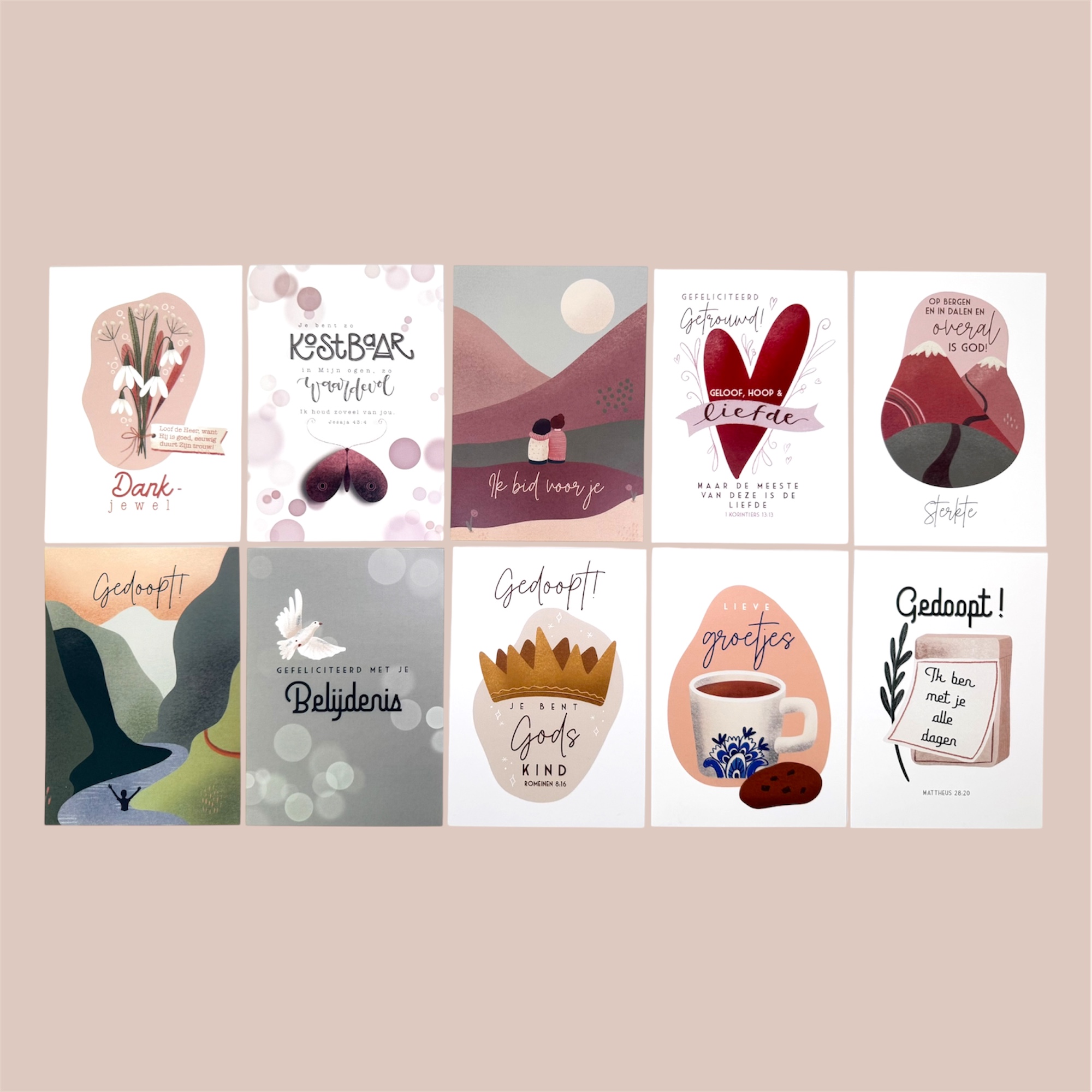 Deze set bevat 10 kleurrijke kaarten van Marjoleins Creations met rechte hoeken, perfect voor belijdenis, huwelijk, overlijden of een andere situatie. Voorzien van bemoedigende (Bijbel-)teksten. Bestel nu en deel een boodschap vol warmte en geloof!