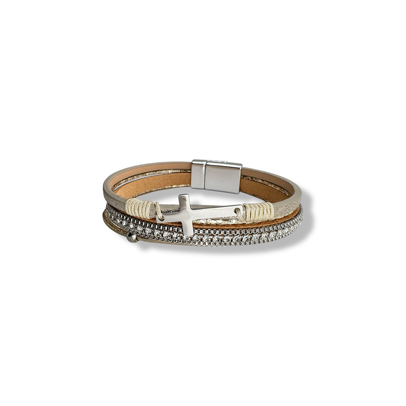 Een verfijnde, vrouwelijke armband van meerdere lagen, subtiel afgewerkt met een sierlijk kruisje – een tijdloos symbool van geloof, hoop en liefde.