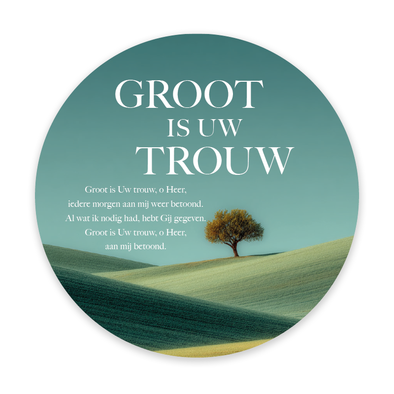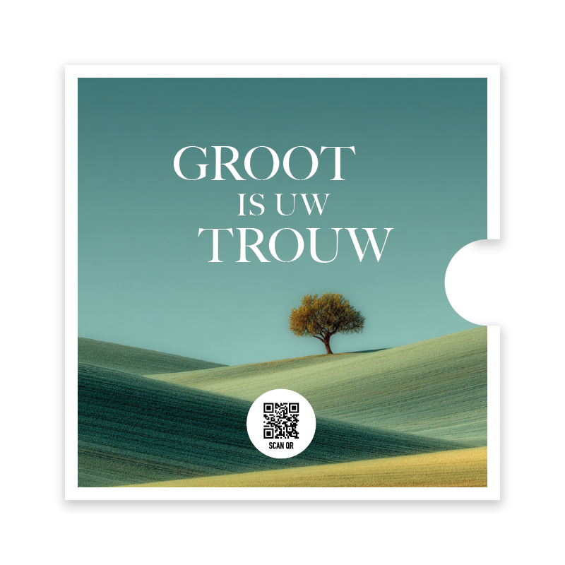Deze ronde kaart bevat de tekst uit Opwekking 123: Groot is Uw trouw en is voorzien van een boom met heuvels. De kaart zit in een cd-hoesje met dezelfde afbeelding en een QR-code die verwijst naar het bijbehorende lied. Een tijdloze kaart die Gods trouw zichtbaar maakt.