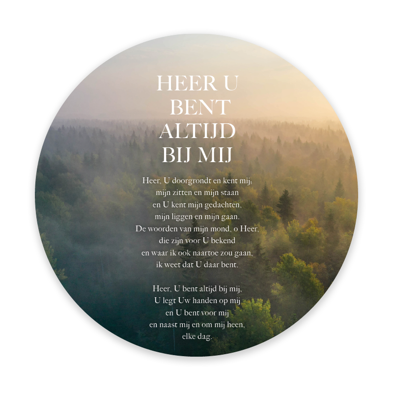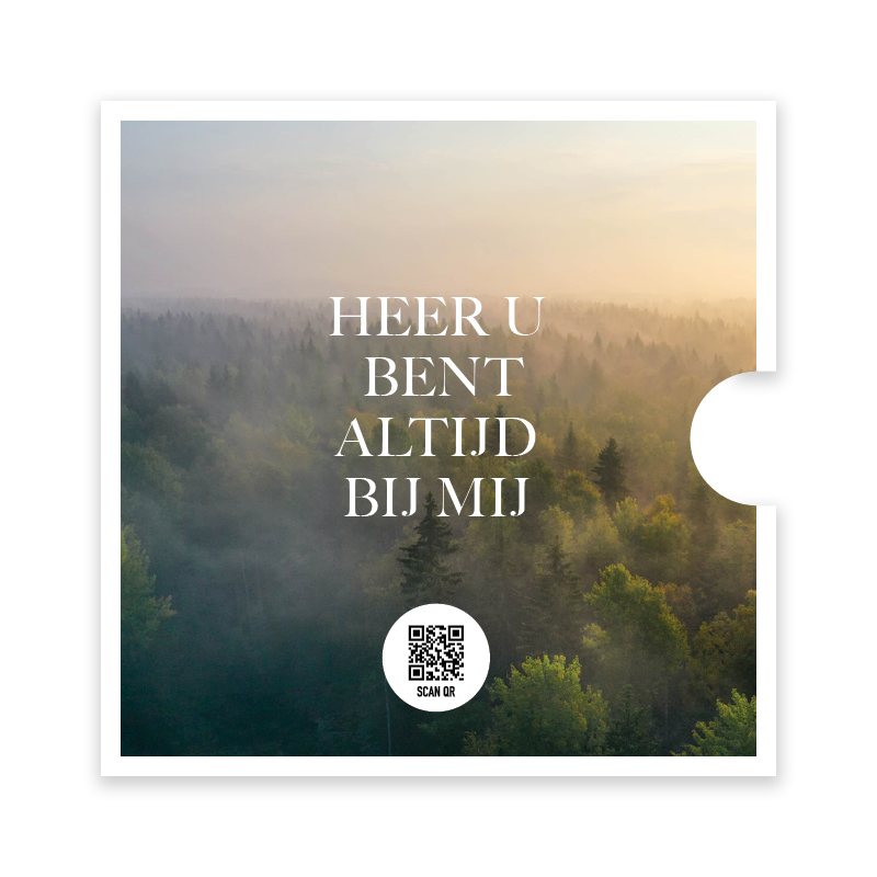 Prachtige ronde fotokaart met een uitgestoken hand en de tekst ‘Heer U bent altijd bij mij’, tegen de achtergrond van een woud. Deze bemoedigende kaart wordt geleverd in een stijlvol singlehoesje en bevat een QR-code die direct leidt naar het muziekbestand van Opwekking 518.