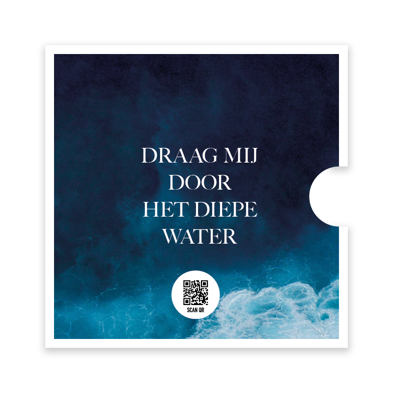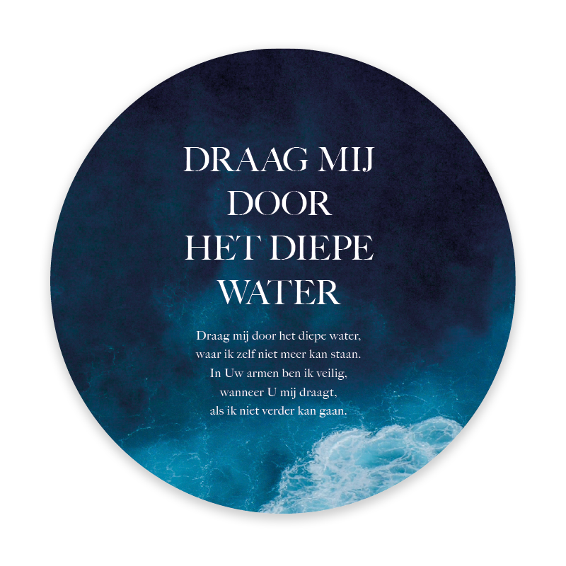 Prachtige ronde fotokaart met de tekst ‘Draag mij door het diepe water’. Deze bijzondere kaart is ontworpen als bemoediging in moeilijke tijden en bevat een QR-code die direct linkt naar het lied Opwekking 581. Verpakt in een stijlvol singlehoesje, ideaal om cadeau te doen of te versturen als troostvolle boodschap.