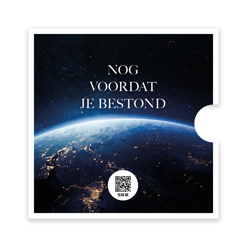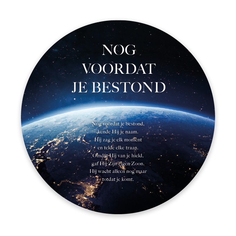 Prachtige ronde fotokaart met op de achtergrond de wereldbol. De kaart is verpakt in een stijlvol singlehoesje met de tekst ‘Nog voordat je bestond’. Een bijzondere kaart ter bemoediging die kracht en troost uitstraalt. De QR-code op de achterkant leidt direct naar het muziekbestand van Opwekking 599.