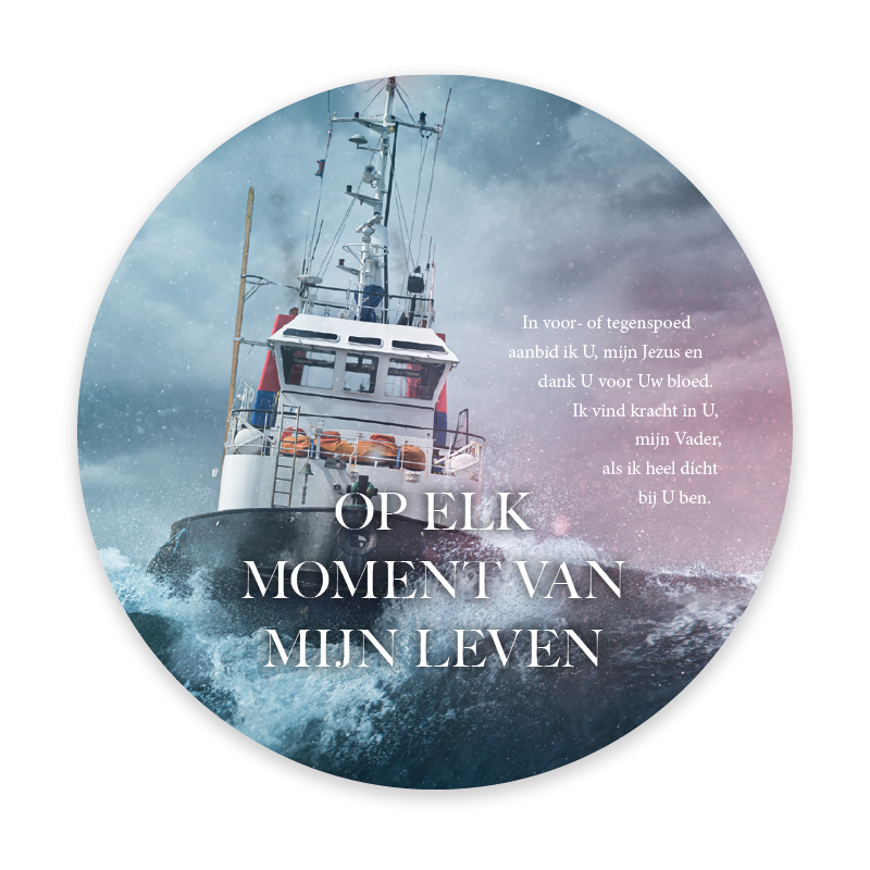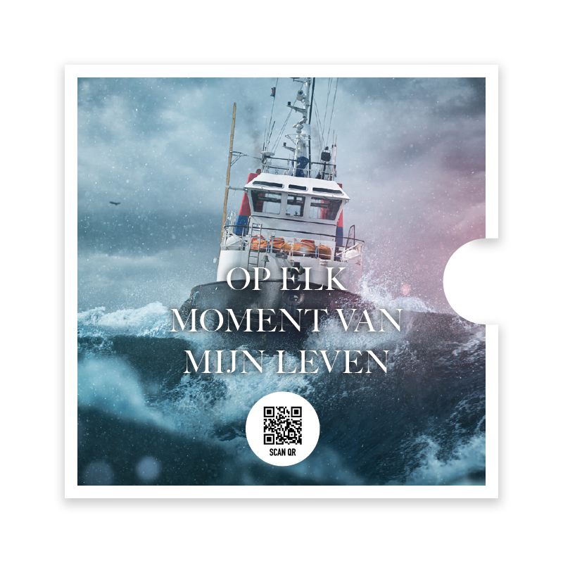 Prachtige ronde fotokaart met de tekst ‘Op elk moment van mijn leven’. Op de achtergrond is een indrukwekkend beeld te zien van een schip in de storm; een krachtig symbool van vertrouwen en hoop in moeilijke tijden. Deze bemoedigende kaart bevat een QR-code die direct leidt naar het lied ‘Opwekking 630’.