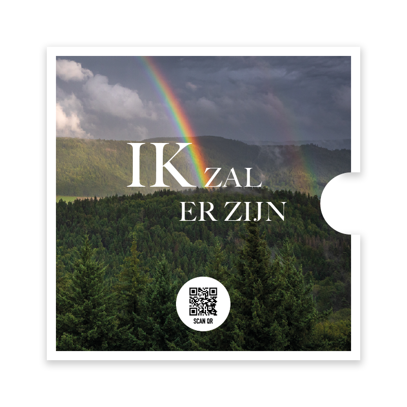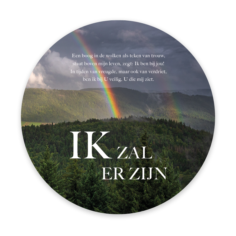 Deze ronde kaart bevat de tekst uit Opwekking 770: Ik zal er zijn en is voorzien van een regenboog, als teken van Gods trouw, ook in moeilijke tijden. De kaart zit in een cd-hoesje met dezelfde afbeelding en een QR-code die verwijst naar het bijbehorende lied. Geschikt om te geven als bemoediging of steun.