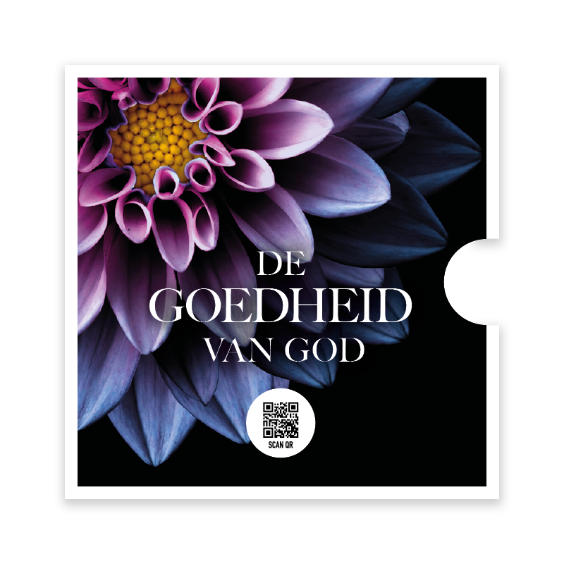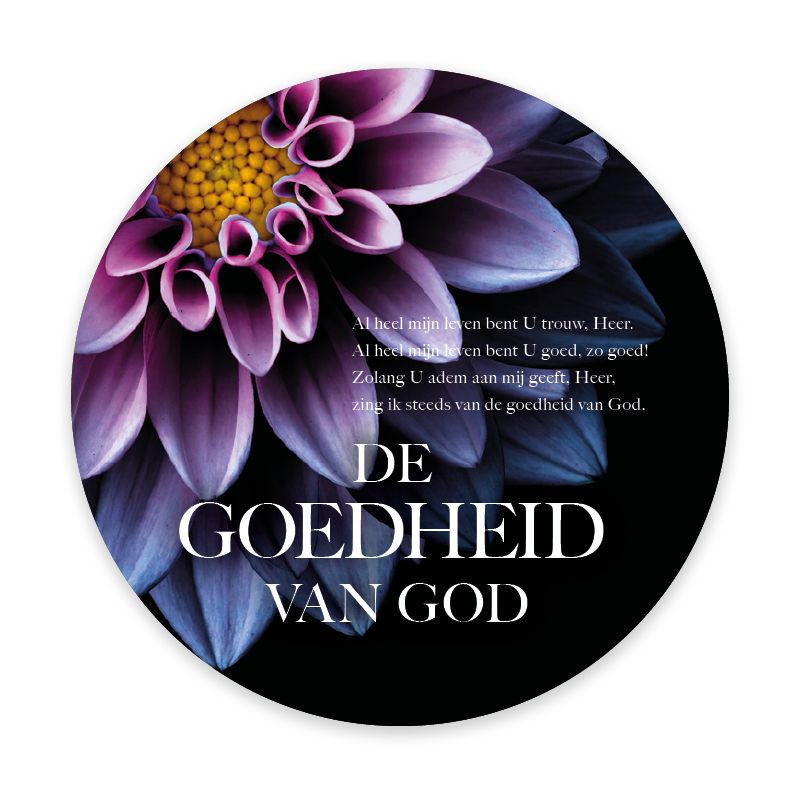 Prachtige ronde fotokaart met de tekst ‘De goedheid van God’ en een sfeervolle achtergrond van een paarse bloem. Een kaart vol bemoediging en geloof, voorzien van een handige QR-code die direct leidt naar het muziekbestand van Opwekking 849. Perfect om iemand mee te troosten of te inspireren.