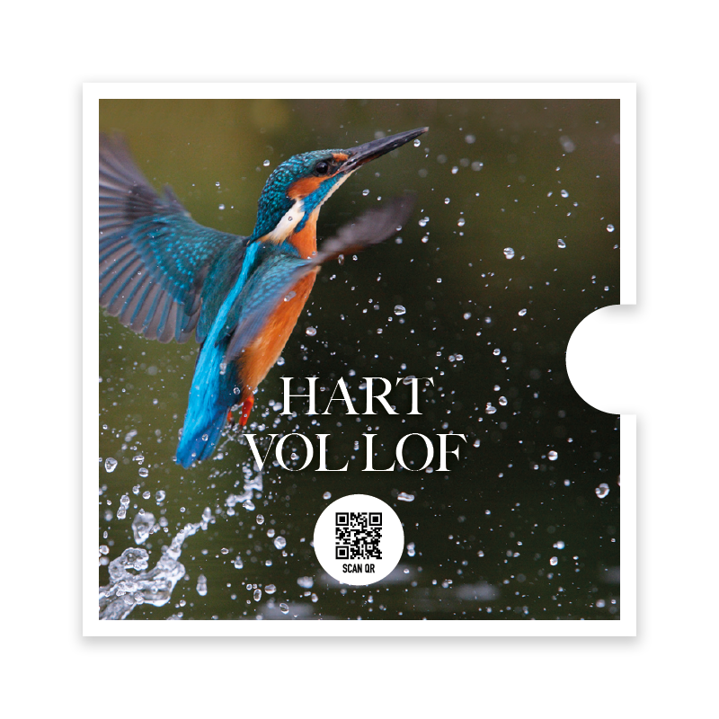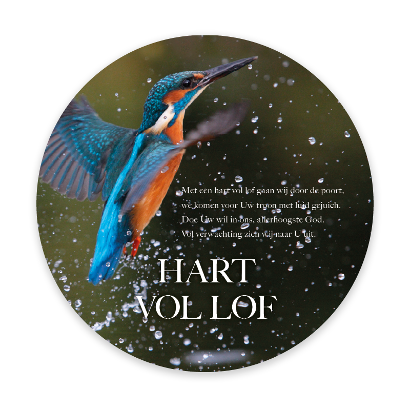 Prachtige ronde fotokaart met de tekst ‘Hart vol lof’ en een sfeervolle afbeelding van een ijsvogel op de achtergrond. Deze kaart is een mooie bemoediging en bevat een QR-code die direct leidt naar het muziekbestand van Opwekking 879. Perfect om iemand te inspireren of op te beuren met een hoopvolle boodschap.