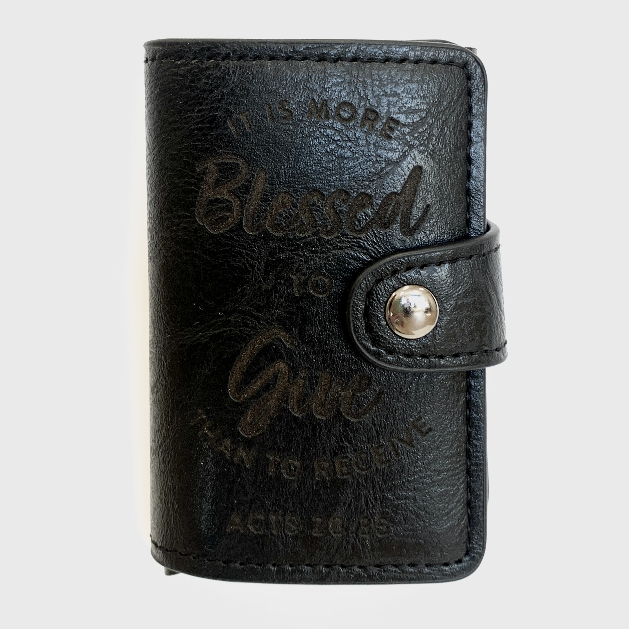 Pasjeshouder ‘Give’ 19,95 Eenvoudig betalen met iDEAL Artikel MA20207N Categorie: Divers Kleur Kies een optieDonkerbruinLichtbruinZwartWissen Pasjeshouder 'Give' aantal In winkelwagen Beschrijving Beschrijving Handige pasjeshouder met vakje voor creditcards, betaalpasjes en andere pasjes. Tekst: ‘It is more blessed to give than to receive. Acts 20:35’. De pasjeshouder is verkrijgbaar in de kleuren zwart, donkerbruin en lichtbruin.