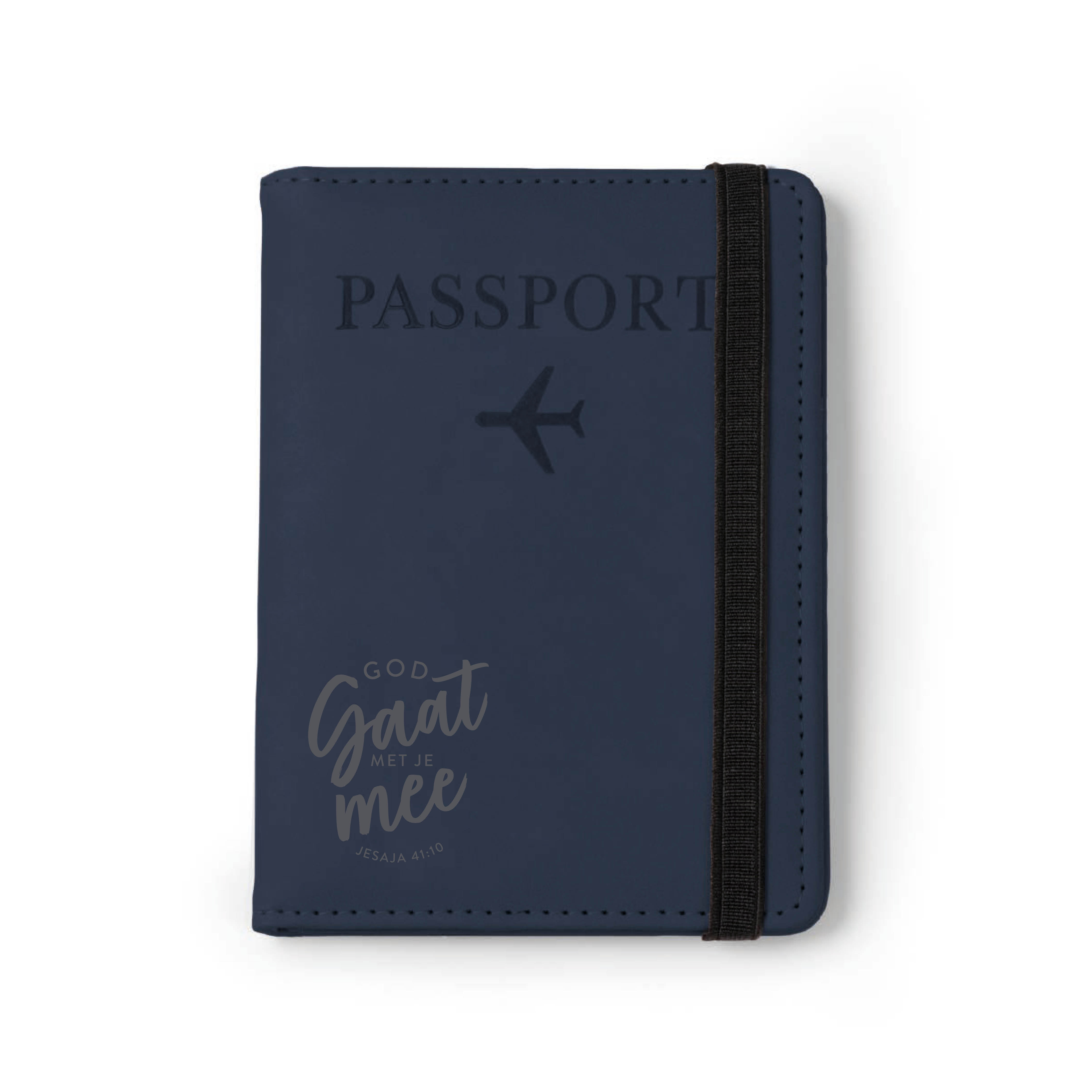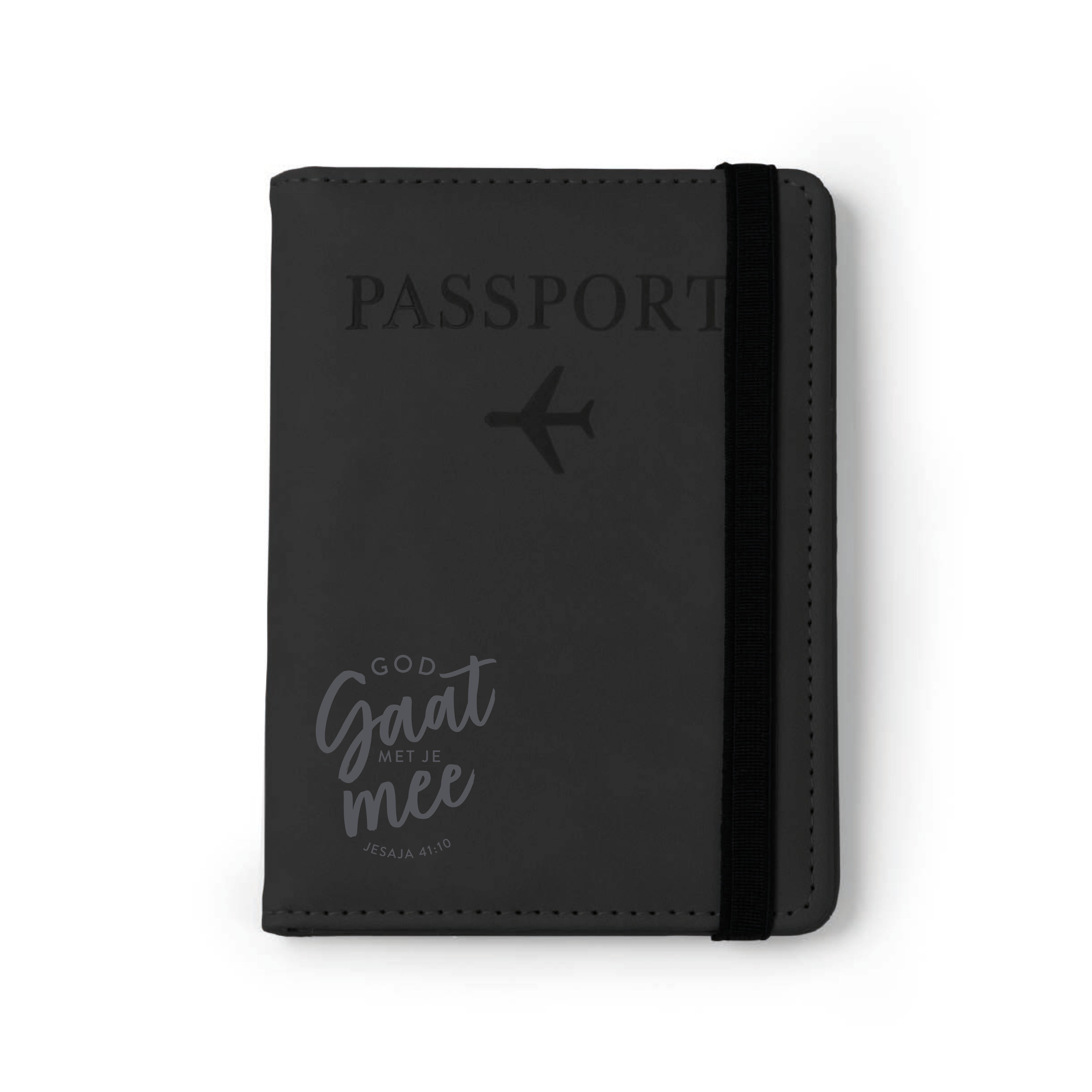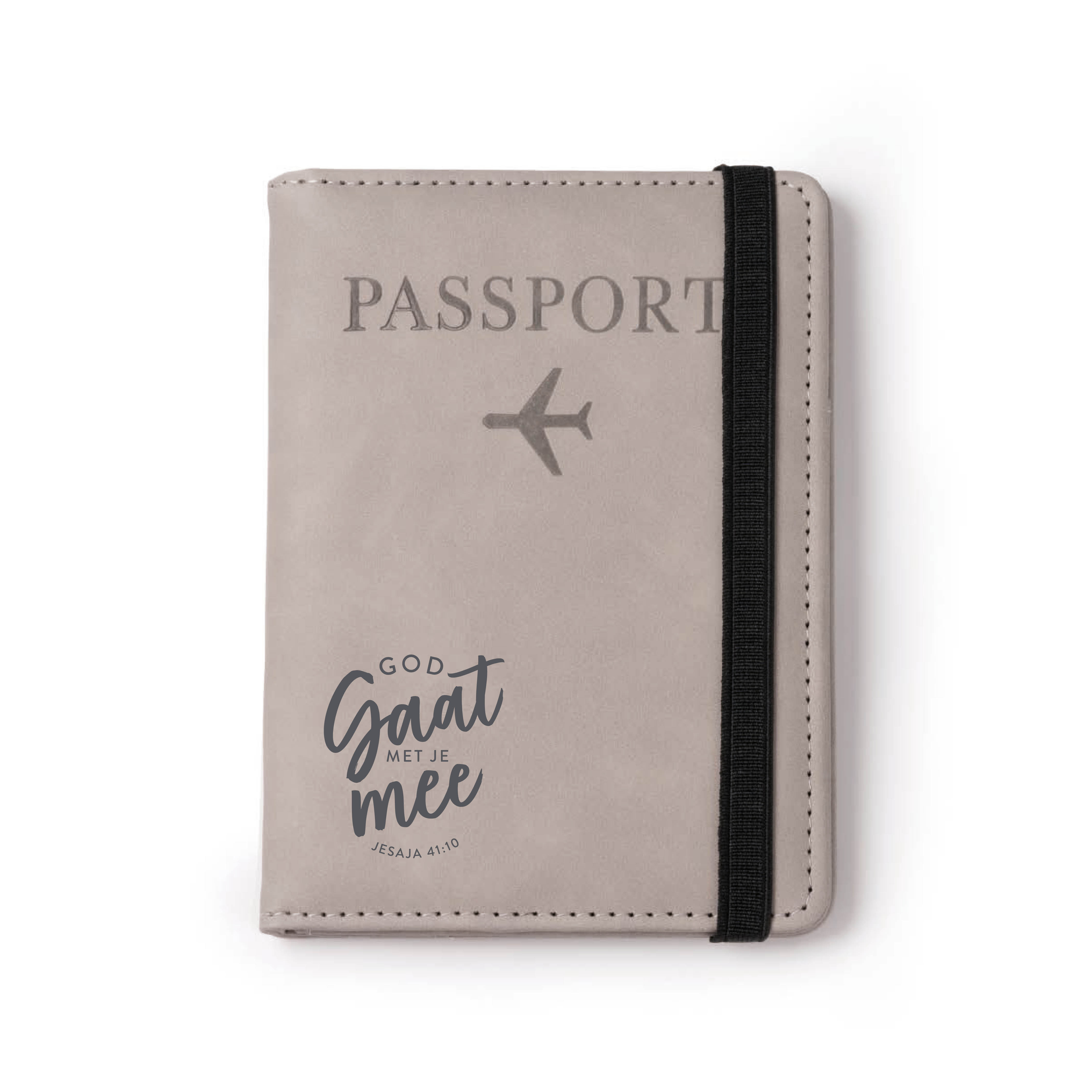 Praktisch en stijlvol paspoortmapje van PU-materiaal, voorzien van een elastische sluitband. Met de bemoedigende tekst: ‘God gaat met je mee’ – Jesaja 41:10.