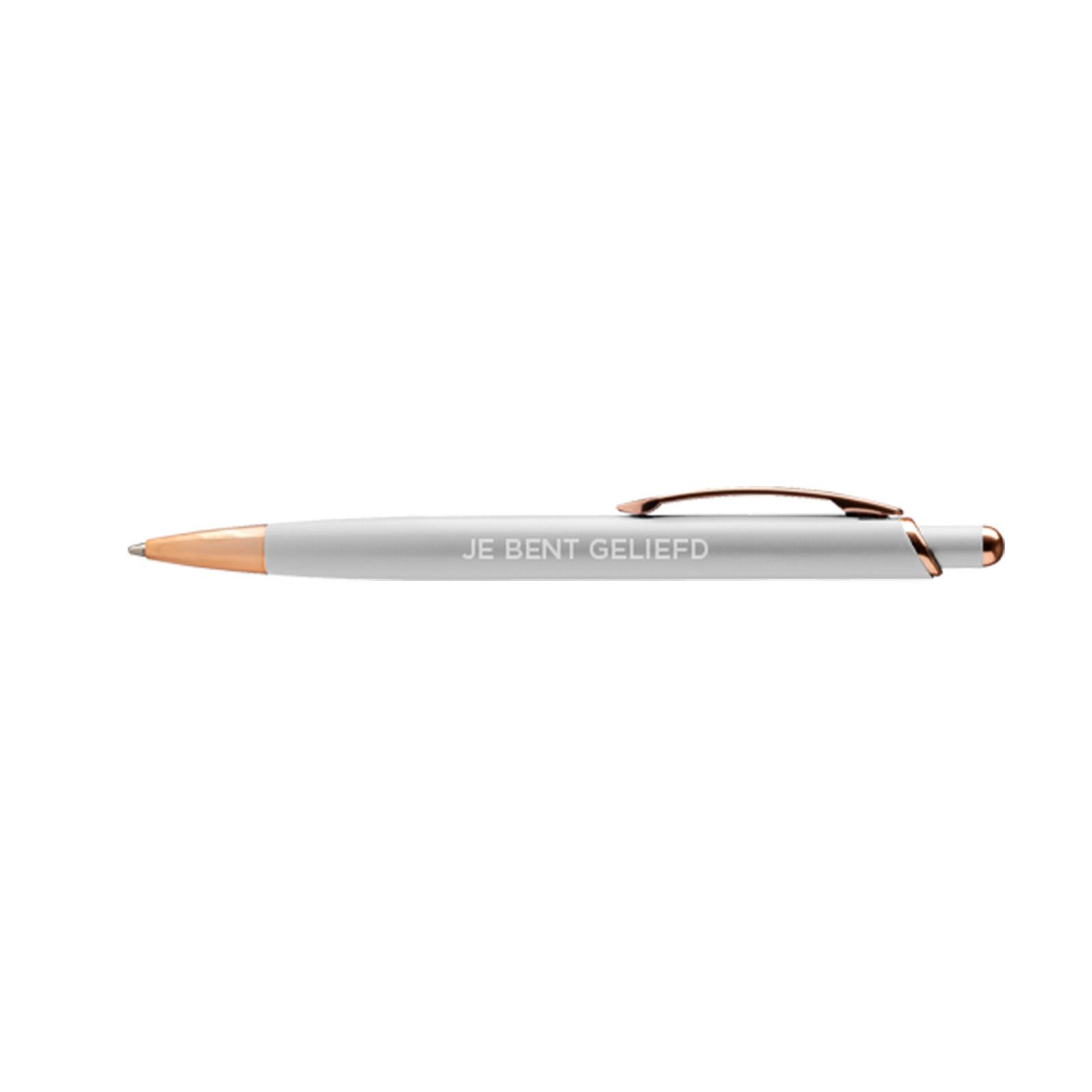 Schrijf met stijl en inspiratie met deze prachtige pen. De pen is luxe afgewerkt en ligt fijn in de hand. Op de pen staat de bemoedigende tekst ‘Je bent geliefd’, een subtiele herinnering aan Gods liefde. Perfect als cadeautje voor een geliefde, vriend of voor jezelf.