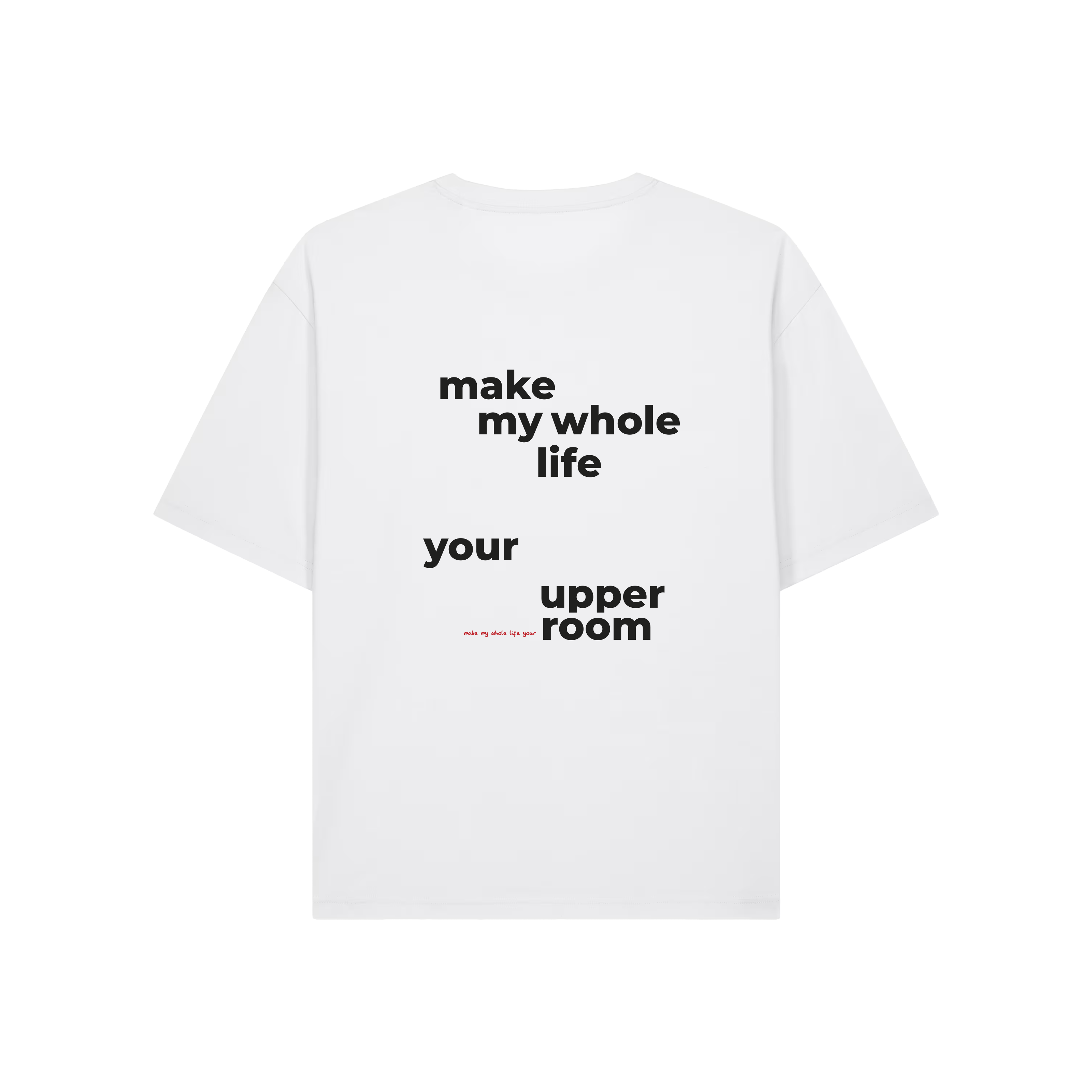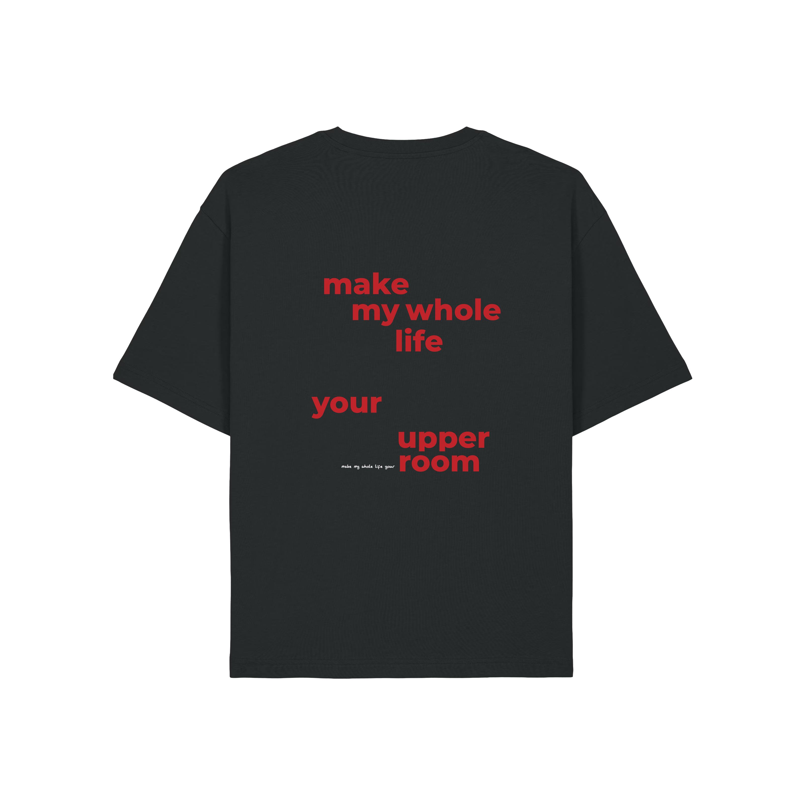 Op de voorkant op middelhoogte staat het woord ‘upperroom’. Het achterpand is voorzien van een grote print met de tekst ‘make my whole life Your upperroom.’