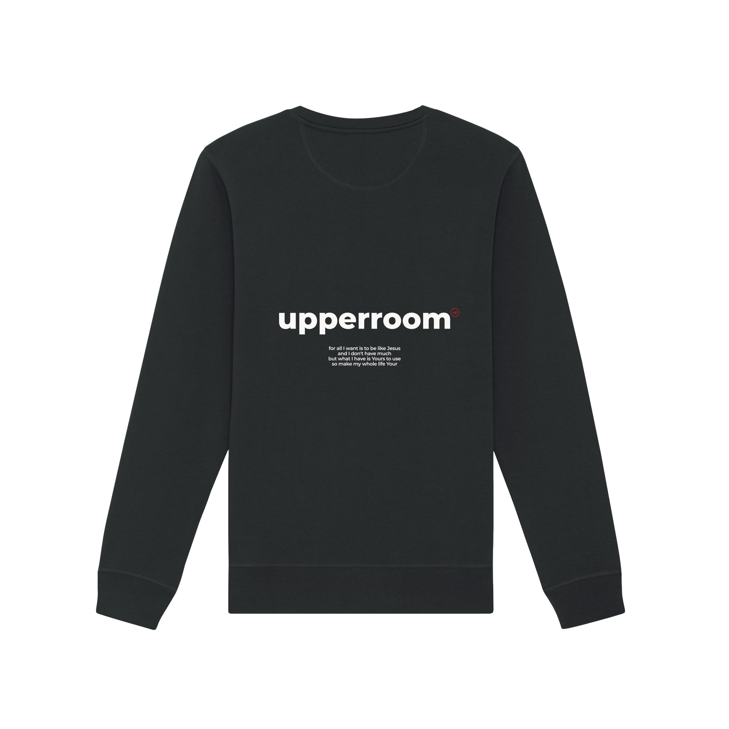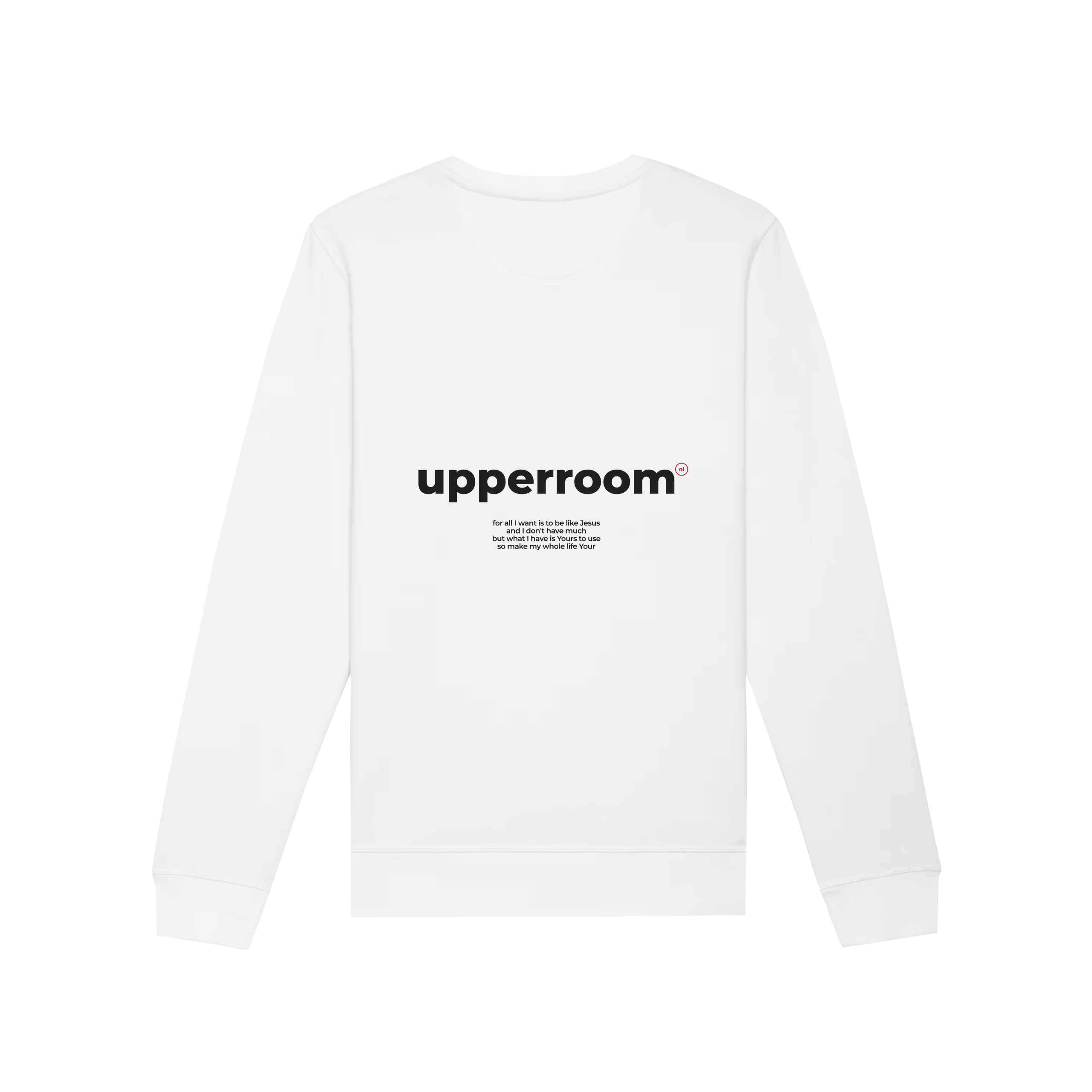 Op de borst staat een subtiel UPPERROOM-logo, terwijl de achterkant is voorzien van een grote rode print met de tekst: ‘make my whole life Your upperroom.’